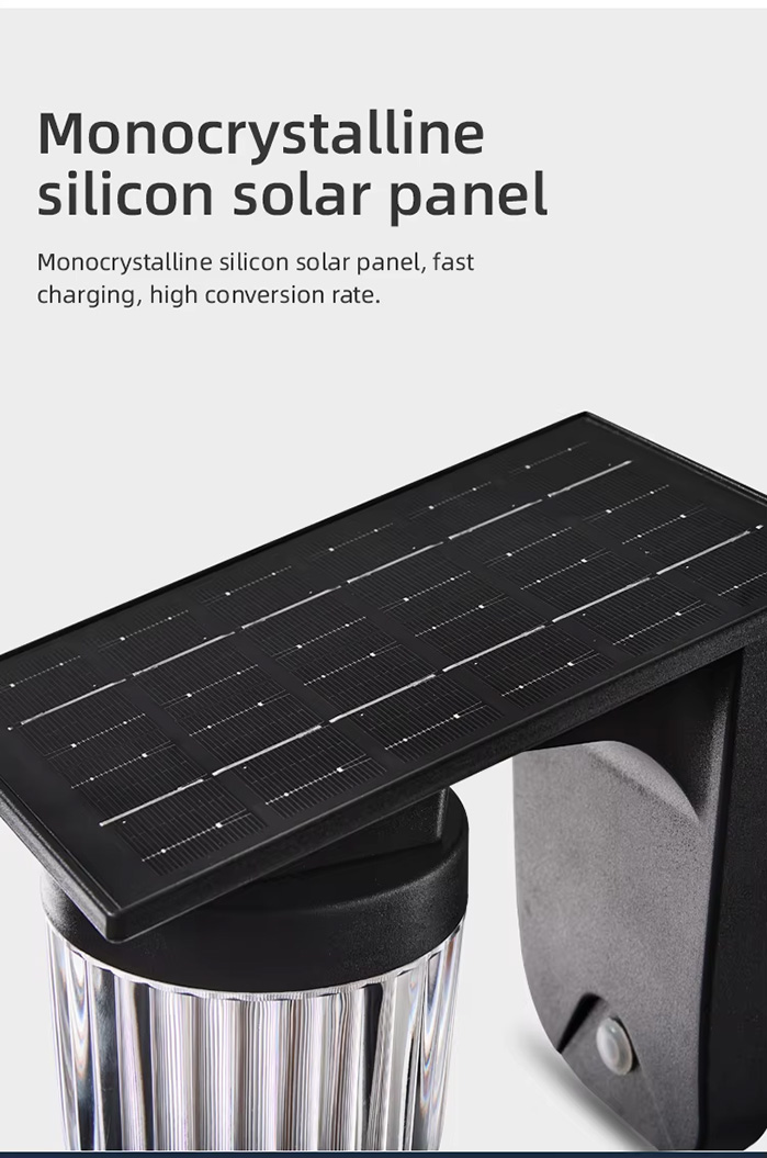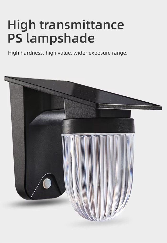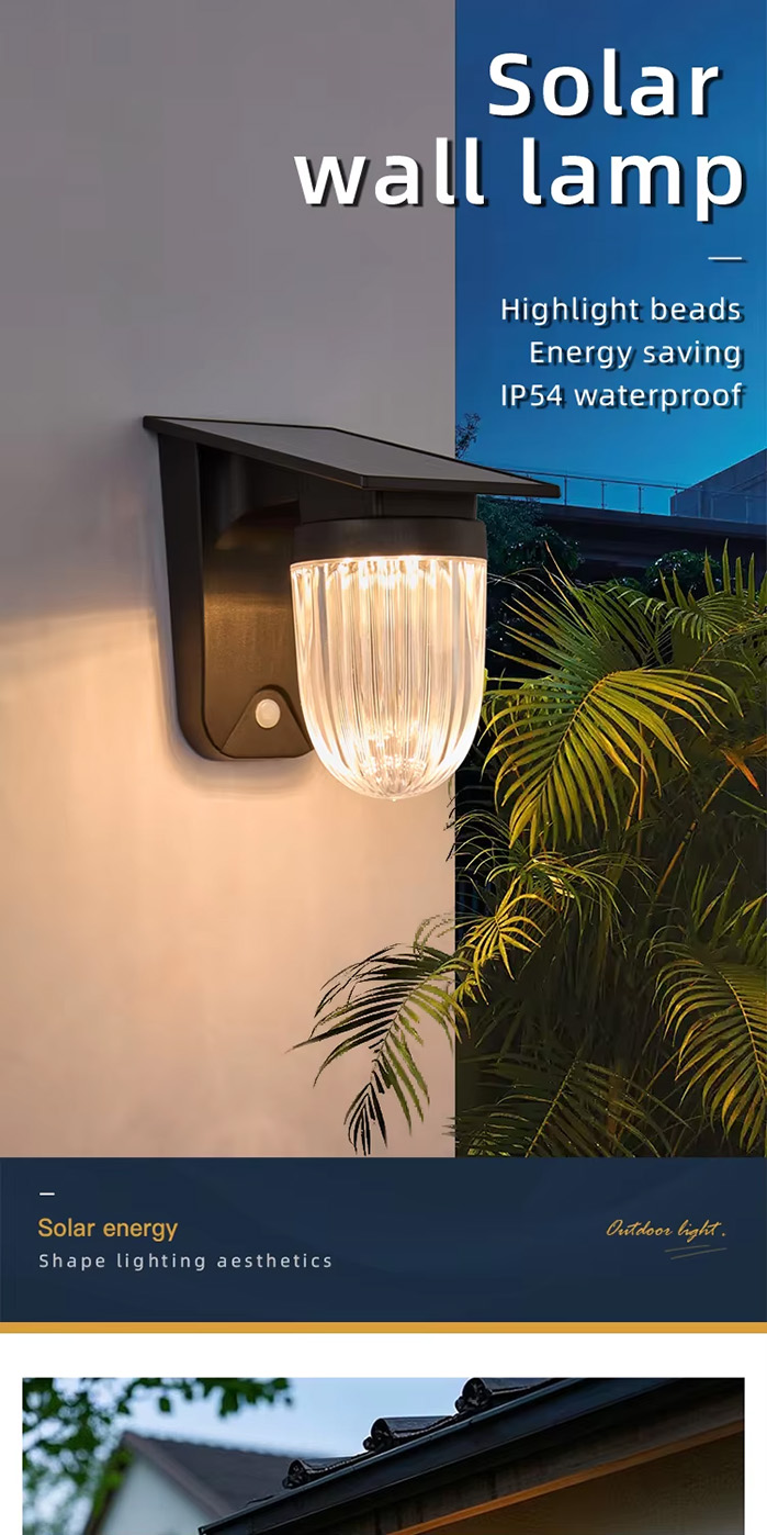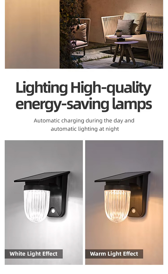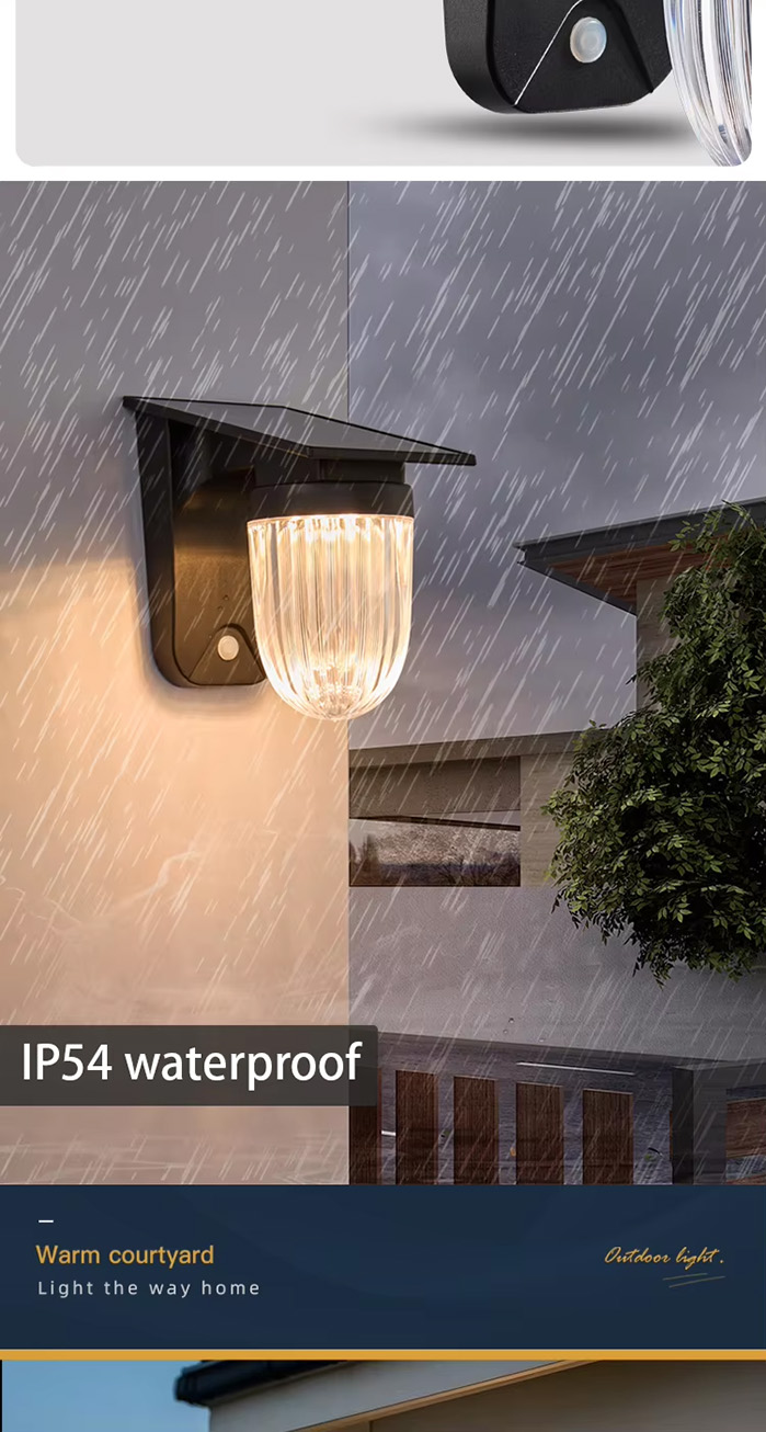This outdoor solar LED wall lamp is waterproof with an IP54 rating, featuring a polysilicon solar panel (6V/2.5W) and a 18650 lithium battery (3.7V/2400mAh). It offers four lighting modes for versatility, including full brightness and energy-saving dimmed mode, while the ABS+PMMA material ensures durability. The lamp provides warm white light (2900-3200K) and operates for 9-10 hours after 3.5-5 hours of charging.