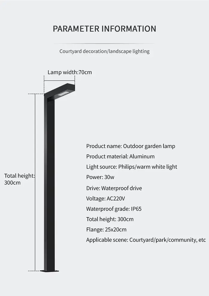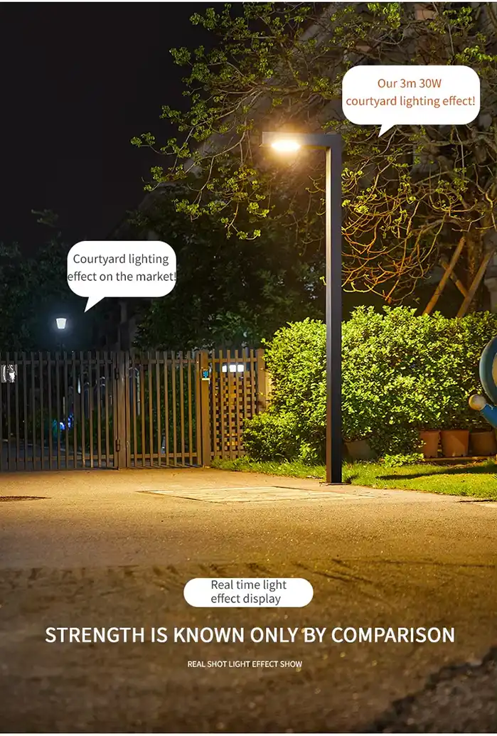This 30W LED garden light features a 270° beam angle and 150 lm/W efficiency. Built with a 3-meter aluminum pole and IP65 waterproof rating, it provides a durable 50,000-hour lighting solution for roads and landscapes.