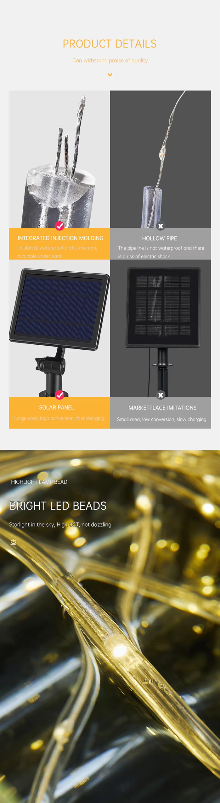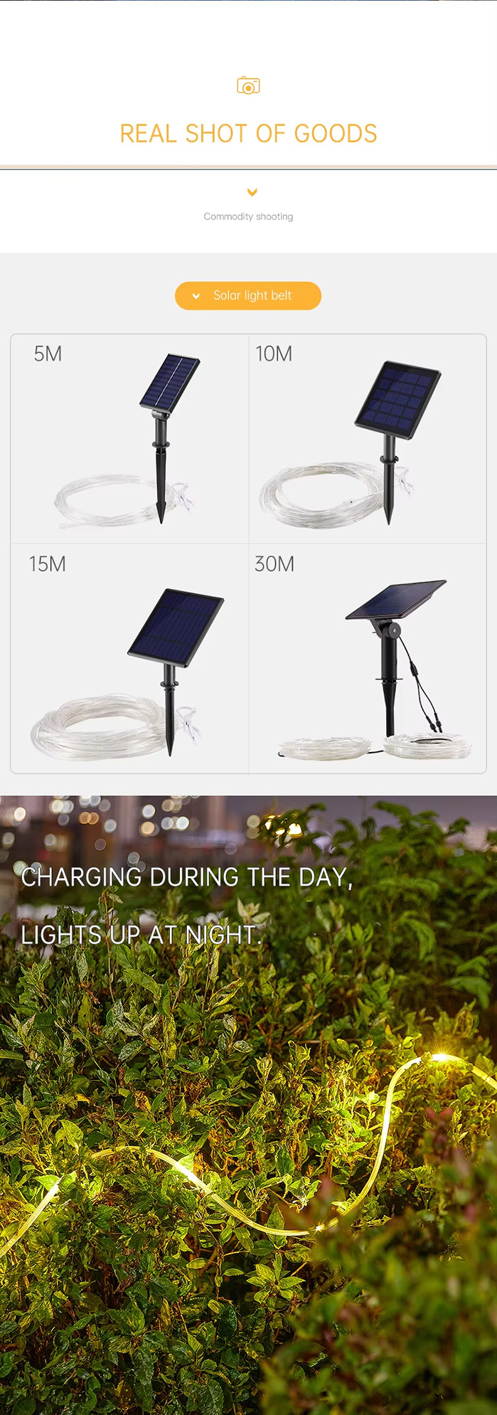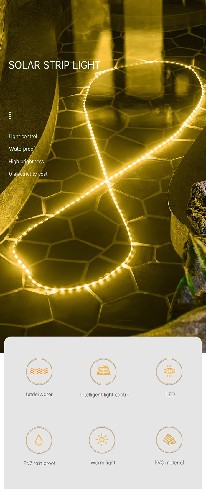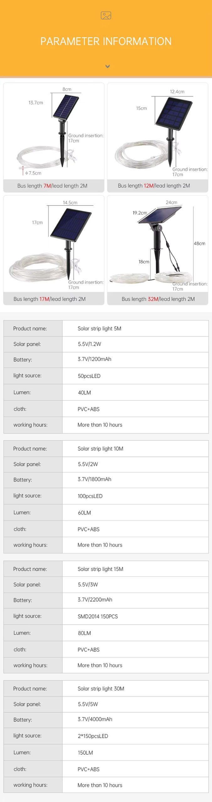 | Working Temperature(℃) | -15 – 45 | Product name | Solar Led Strip Light |