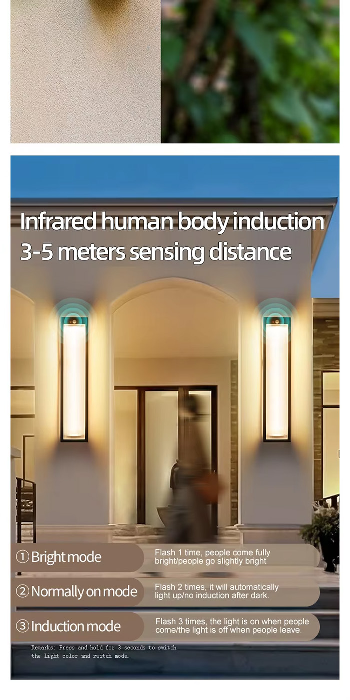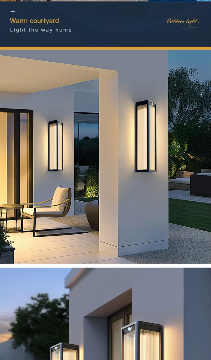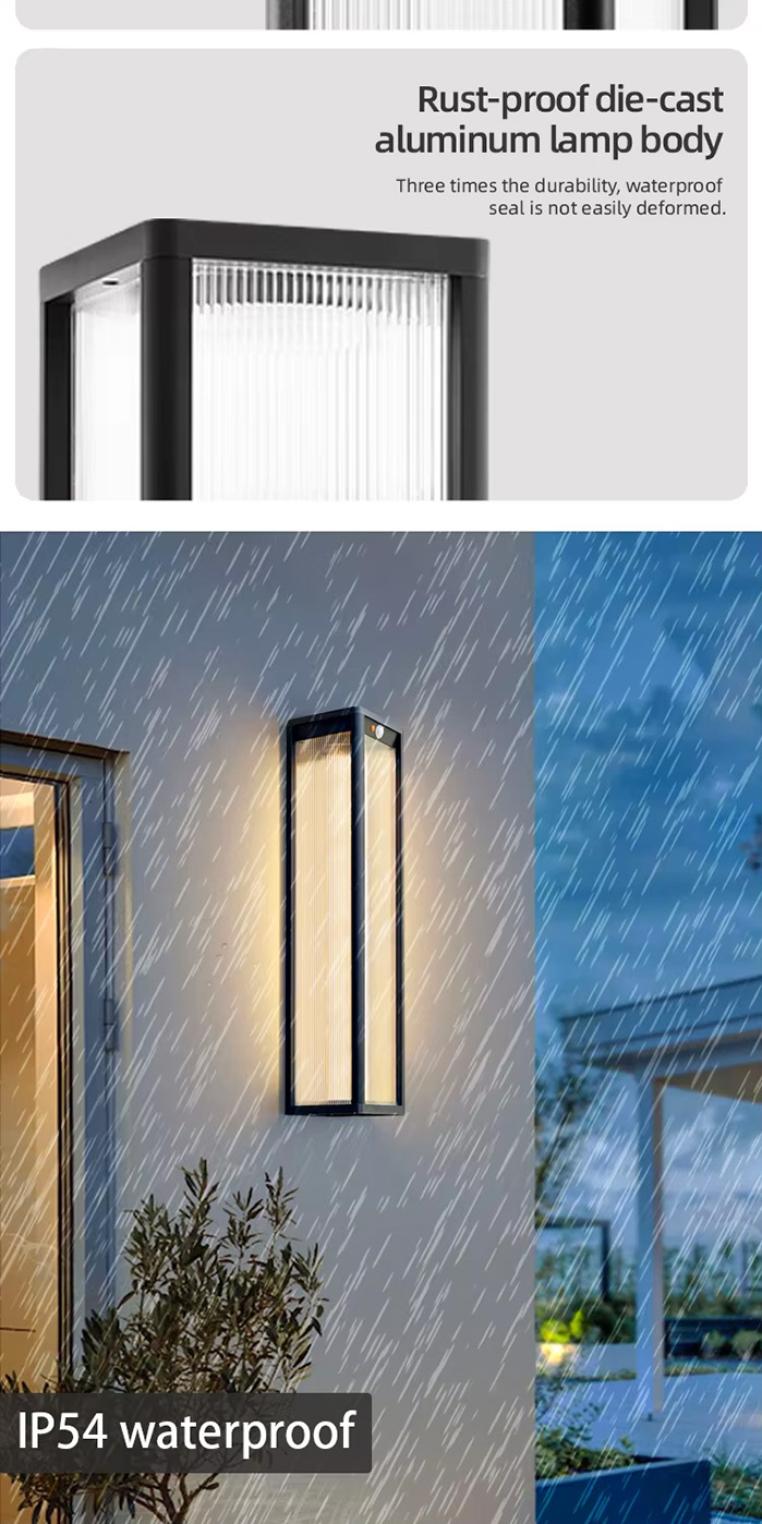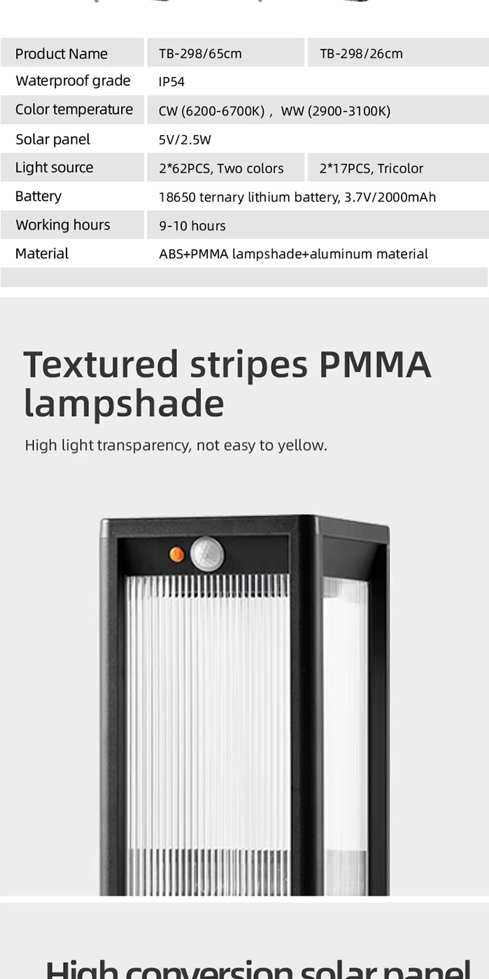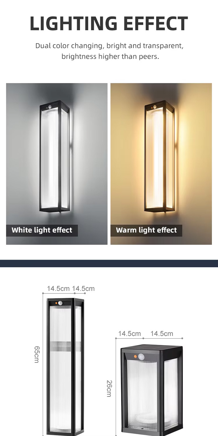 This Smart Solar Wall Light features a motion sensor, 3 brightness modes, and an IP55 waterproof rating, making it ideal for outdoor spaces like gardens, porches, and pathways. Equipped with a monocrystalline silicon solar panel (5V/2.5W) and a 18650 lithium battery (3.7V/2000mAh), it offers 9-10 hours of working time and customizable color temperatures including warm light (2900-3200K). The durable aluminum, ABS, and PMMA construction ensures longevity and performance.