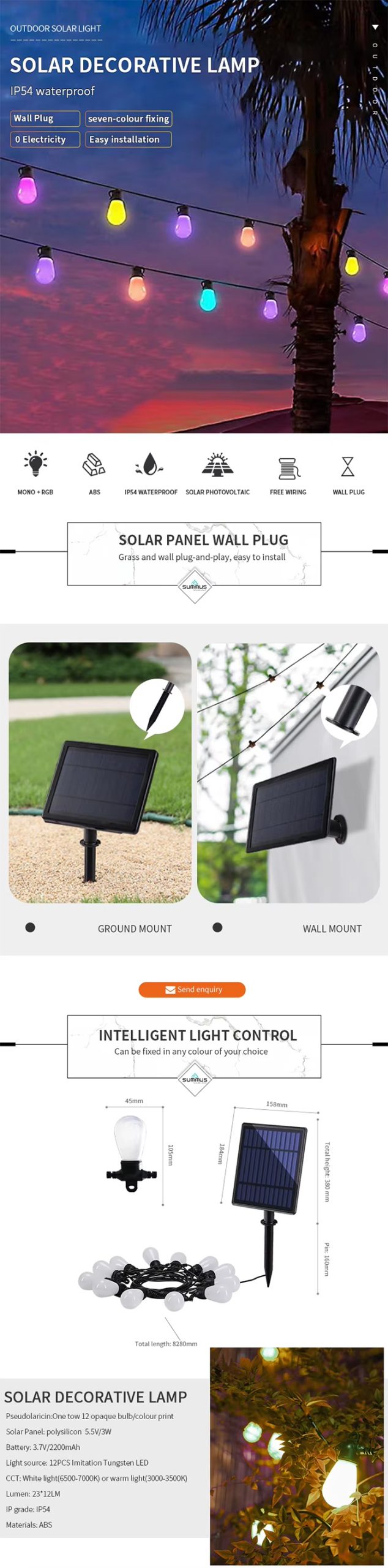 SUMMUS SOLAR LIGHT solar holiday lights feature IP65 waterproof protection and deliver 12-13 hours of warm white (3500K) illumination. With a 3W polysilicon solar panel, 2000mAh lithium battery, and 50,000-hour lifespan, they offer reliable cord-free decoration for Christmas and other occasions.
