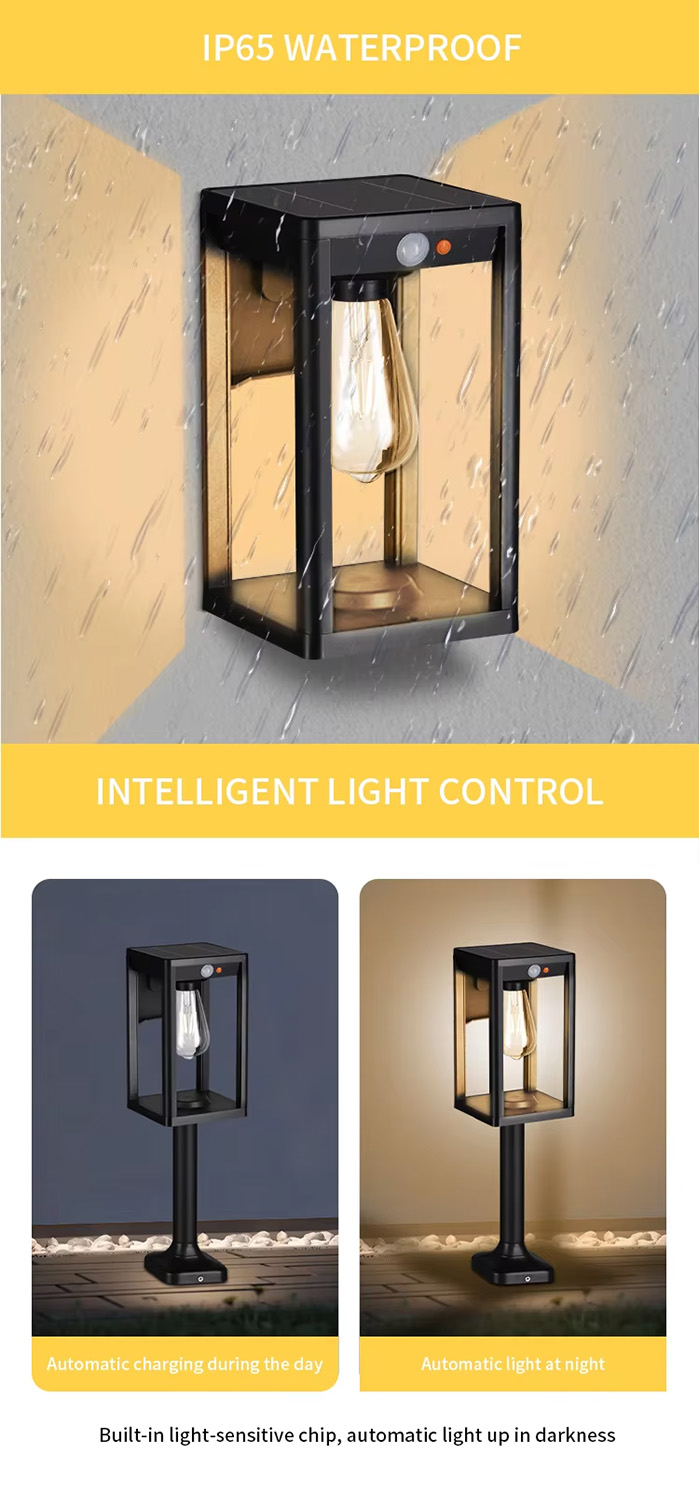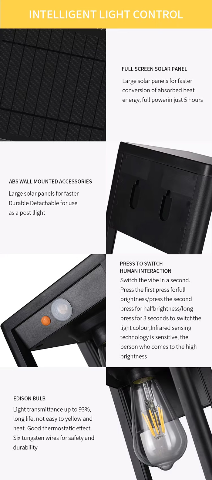 High-Quality Solar Wall Light with motion sensor technology, offering convenient motion-activated lighting that enhances security and energy efficiency. It features a high luminosity of 300LM with a classic Edison bulb design, adding vintage charm to outdoor decor. Crafted from durable die-cast aluminum and ABS materials, it is IP55 waterproof rated for reliable performance in harsh weather. Powered by a 6V 2.3W monocrystalline silicon solar panel, it provides eco-friendly and cost-effective lighting with a long lifespan of up to 50,000 hours. Adjustable brightness modes cater to various lighting needs, making it perfect for gardens, pathways, and outdoor spaces.