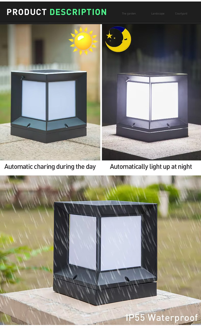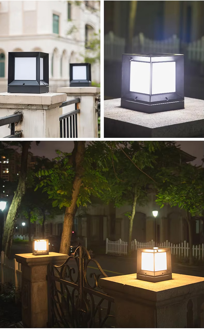 This Modern Outdoor IP55 Waterproof Square Gate Fence Garden Post 2W Led Solar Pillar Light features a durable PS lampshade and die-cast aluminum lamp body, providing excellent moisture resistance. With a high-efficiency SMD2835 LED chip, it delivers 120LM luminosity and supports dual light color modes (6500-7000K white light and 2800-3100K warm light). The built-in 3.7V/2500mAh battery ensures 9-12 hours of working time after an 8-hour charge, making it ideal for garden gate columns. Its compact size of 15*15*19CM and sleek black & white design enhance outdoor aesthetics while offering reliable solar-powered lighting.