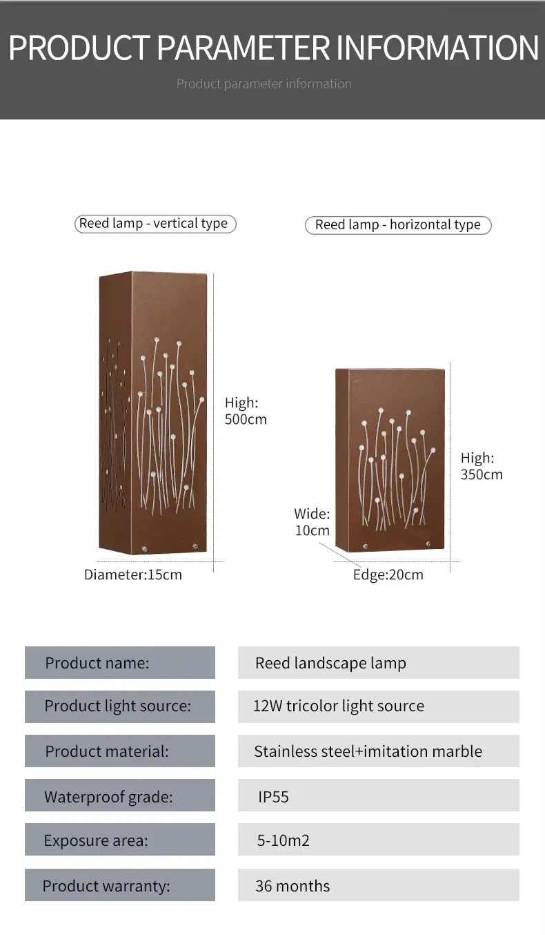 | Size | 10*20*35cm / 15*15*35cm / 12*12*40cm / 15*15*50cm | Style | Modern Outdoor Luminaires |